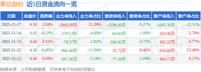 证券之星消息,截至2025年11月17日收盘,泰达股份(000652)报收于4.5元,上涨2.04%,换手率2.13%,成交量31.46万手,成交额1.4亿元。