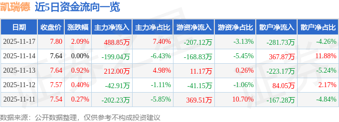 11月17日的资金流向数据方面,主力资金净流入488.85万元,占总成交额7.4%,游资资金净流出207.12万元,占总成交额3.13%,散户资金净流出281.73万元,占总成交额4.26%。