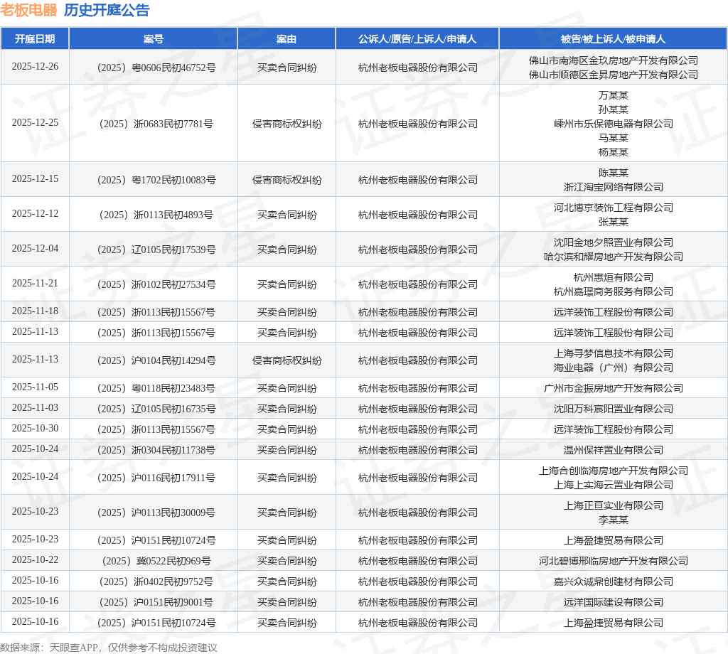 案号:(2025)浙0113民初15567号根据统计,近一年内以杭州老板电器股份有限公司为当事人的历史开庭公告有225则,其中案由为“买卖合同纠纷”的公告以150则居首,其次为“侵害商标权纠纷”有43则,“承揽合同纠纷”有5则。历史开庭公告(前20条)如下: