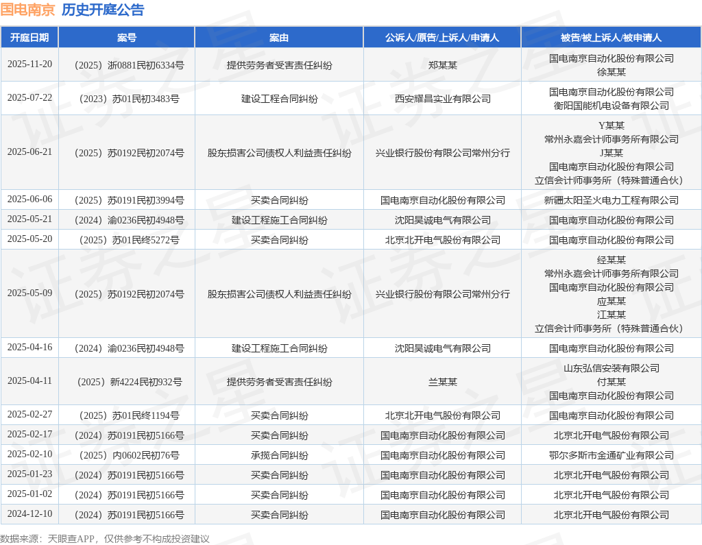案号:(2025)浙0881民初6334号根据统计,近一年内以国电南京自动化股份有限公司为当事人的历史开庭公告有15则,其中案由为“买卖合同纠纷”的公告以7则居首,其次为“建设工程施工合同纠纷”有2则,“提供劳务者受害责任纠纷”有2则。历史开庭公告如下: