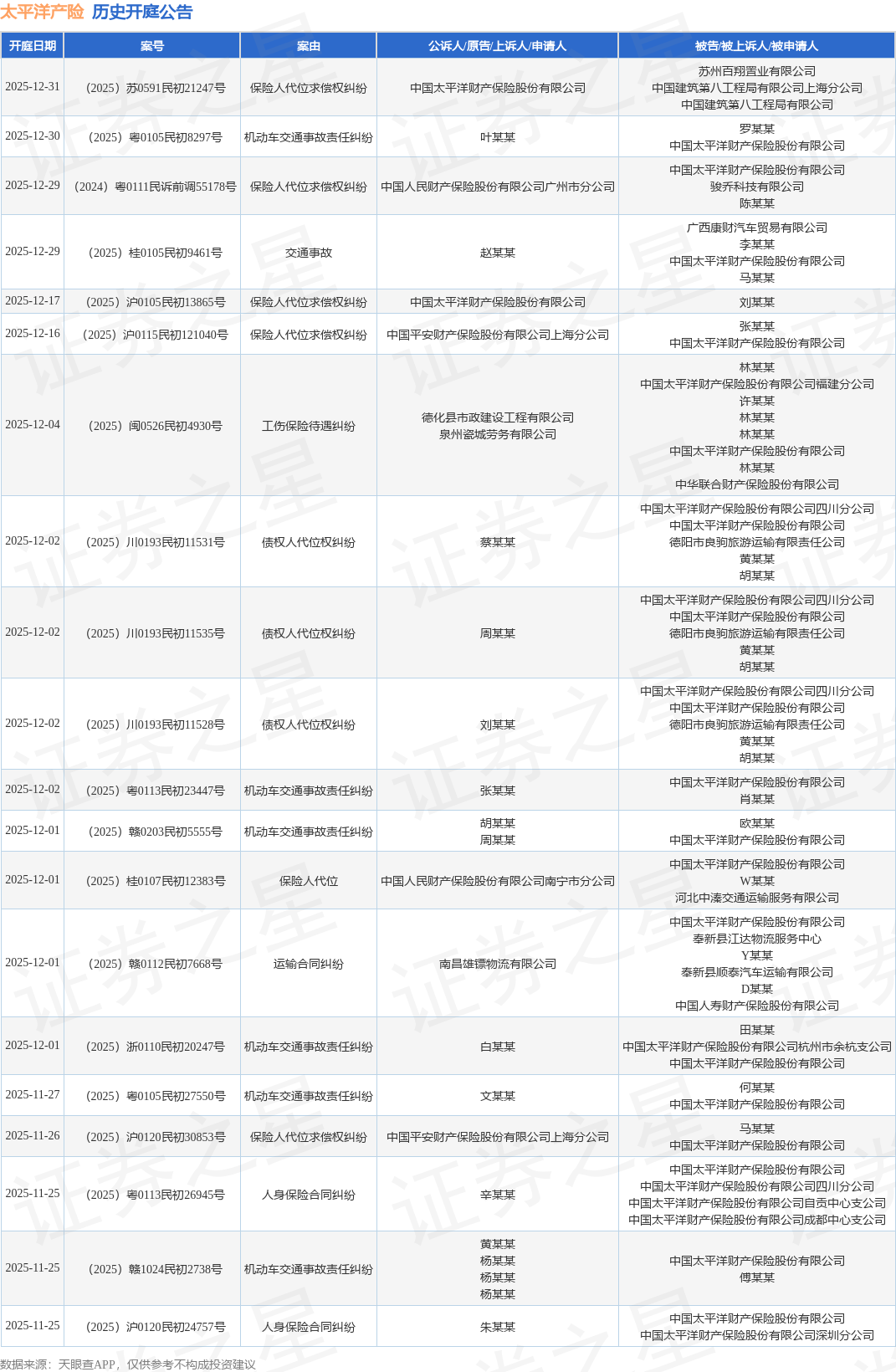 案号:(2025)粤0111民初14654号根据统计,近一年内以中国太平洋财产保险股份有限公司为当事人的历史开庭公告有740则,其中案由为“机动车交通事故责任纠纷”的公告以481则居首,其次为“保险人代位求偿权纠纷”有77则,“非机动车交通事故责任纠纷”有25则。历史开庭公告(前20条)如下: