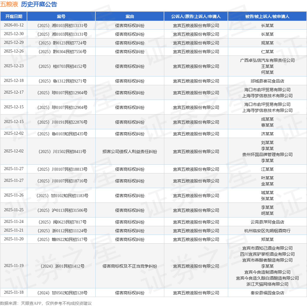 案号:(2025)赣0922知民初517号根据统计,近一年内以宜宾五粮液股份有限公司为当事人的历史开庭公告有339则,其中案由为“侵害商标权纠纷”的公告以301则居首,其次为“商标权权属、侵权纠纷”有16则,“侵害商标权”有6则。历史开庭公告(前20条)如下: