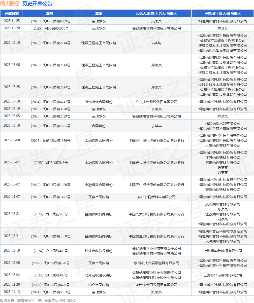 案号:(2025)闽05民终6370号根据统计,近一年内以福建纳川管材科技股份有限公司为当事人的历史开庭公告有24则,其中案由为“劳动争议”的公告以5则居首,其次为“金融借款合同纠纷”有5则,“建设工程施工合同纠纷”有4则。历史开庭公告(前20条)如下: