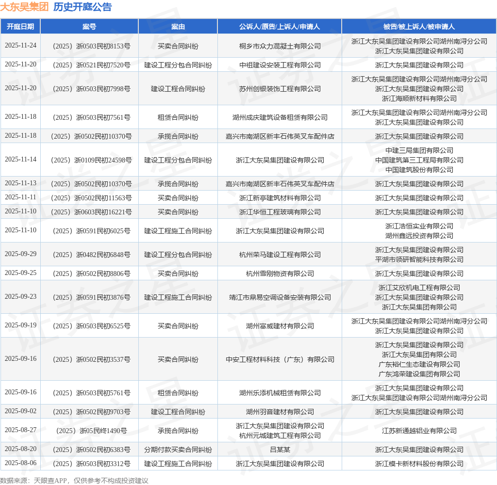 案号:(2025)浙0503民初7998号根据统计,近一年内以浙江大东吴集团建设有限公司为当事人的历史开庭公告有55则,其中案由为“建设工程施工合同纠纷”的公告以11则居首,其次为“买卖合同纠纷”有9则,“建设工程合同纠纷”有7则。历史开庭公告(前20条)如下:
