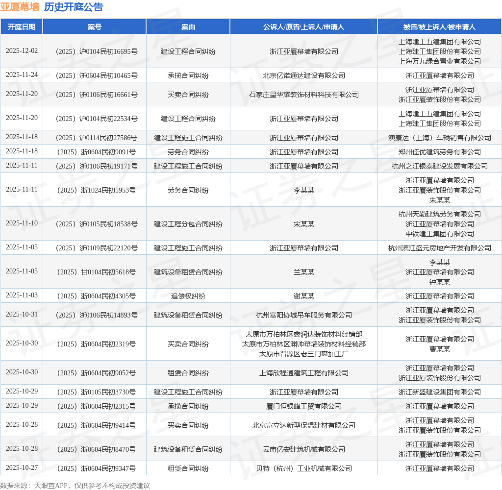案号:(2025)沪0104民初22534号根据统计,近一年内以浙江亚厦幕墙有限公司为当事人的历史开庭公告有232则,其中案由为“建设工程施工合同纠纷”的公告以45则居首,其次为“买卖合同纠纷”有39则,“建设工程分包合同纠纷”有30则。历史开庭公告(前20条)如下: