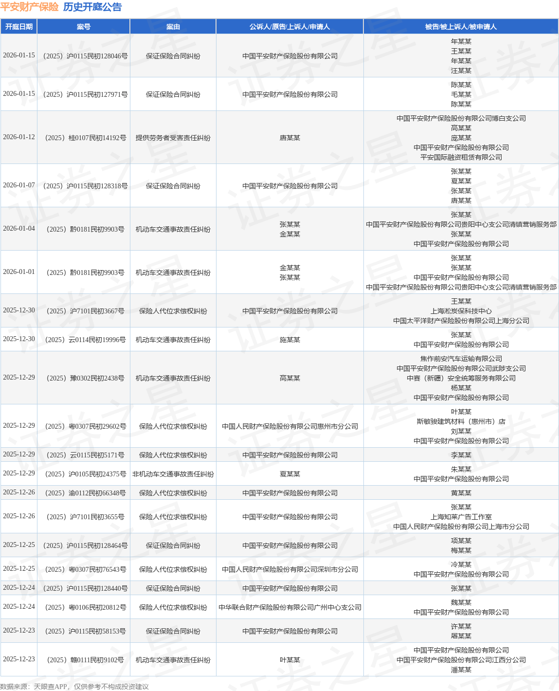 案号:(2025)浙0503民初8120号根据统计,近一年内以中国平安财产保险股份有限公司为当事人的历史开庭公告有2285则,其中案由为“机动车交通事故责任纠纷”的公告以1102则居首,其次为“保证保险合同纠纷”有276则,“保险人代位求偿权纠纷”有186则。历史开庭公告(前20条)如下: