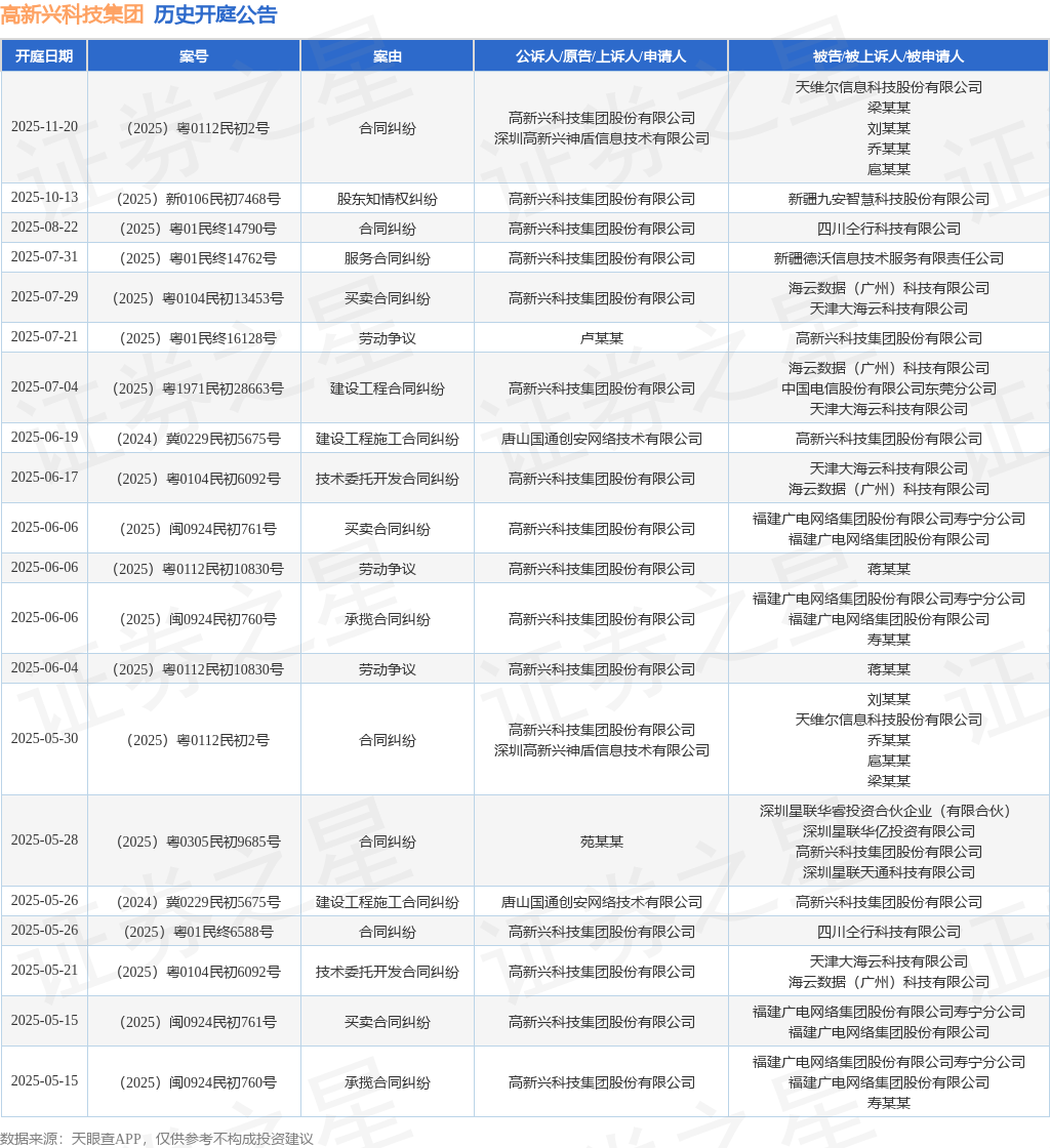 案号:(2025)粤0112民初2号根据统计,近一年内以高新兴科技集团股份有限公司为当事人的历史开庭公告有40则,其中案由为“买卖合同纠纷”的公告以10则居首,其次为“劳动争议”有9则,“合同纠纷”有8则。历史开庭公告(前20条)如下: