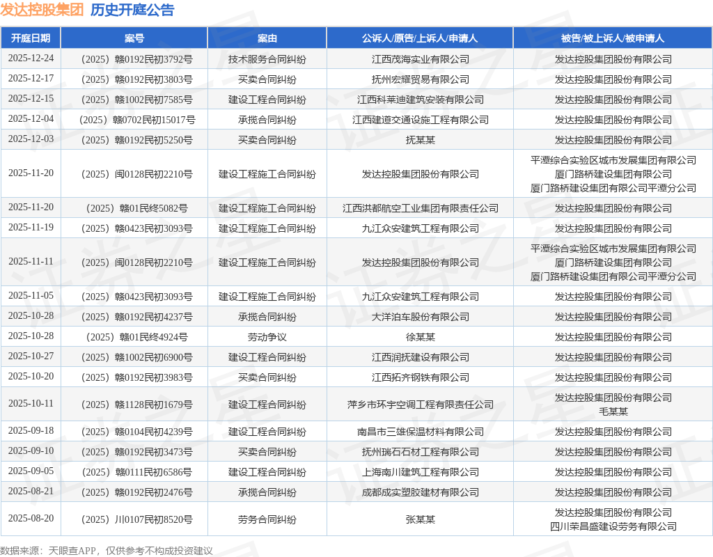 案号:(2025)赣01民终5082号根据统计,近一年内以发达控股集团股份有限公司为当事人的历史开庭公告有67则,其中案由为“买卖合同纠纷”的公告以21则居首,其次为“建设工程合同纠纷”有9则,“建设工程施工合同纠纷”有9则。历史开庭公告(前20条)如下: