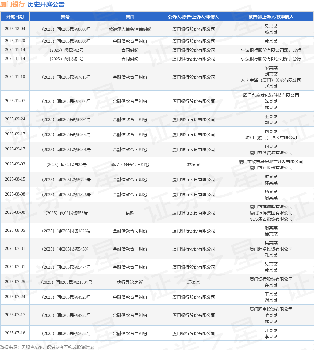 案号:(2025)闽0205民初8586号根据统计,近一年内以厦门银行股份有限公司为当事人的历史开庭公告有75则,其中案由为“金融借款合同纠纷”的公告以54则居首,其次为“申请确认仲裁协议效力”有6则,“信用卡纠纷”有3则。历史开庭公告(前20条)如下: