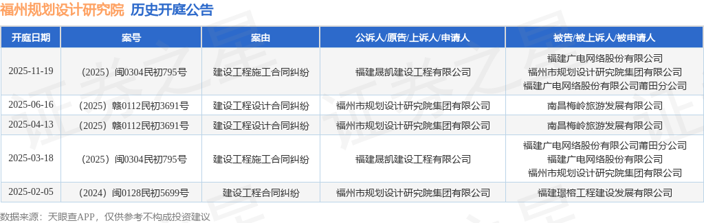 案号:(2025)闽0304民初795号根据统计,近一年内以福州市规划设计研究院集团有限公司为当事人的历史开庭公告有5则,其中案由为“建设工程施工合同纠纷”的公告以2则居首,其次为“建设工程设计合同纠纷”有2则,“建设工程合同纠纷”有1则。历史开庭公告如下:
