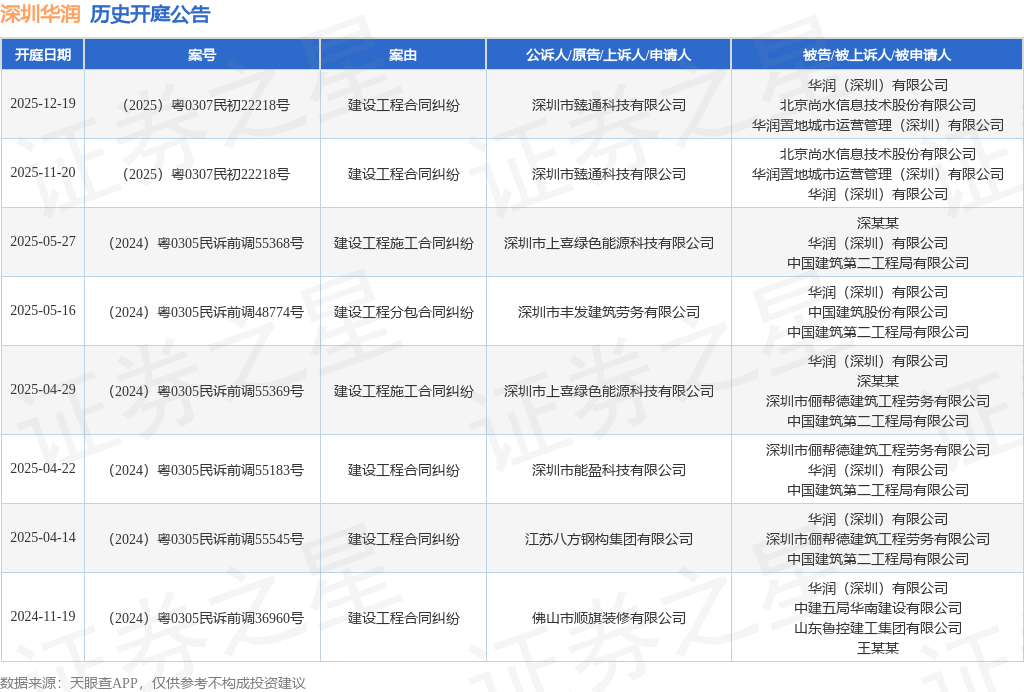 案号:(2025)粤0307民初22218号根据统计,近一年内以华润(深圳)有限公司为当事人的历史开庭公告有8则,其中案由为“建设工程合同纠纷”的公告以5则居首,其次为“建设工程施工合同纠纷”有2则,“建设工程分包合同纠纷”有1则。历史开庭公告如下: