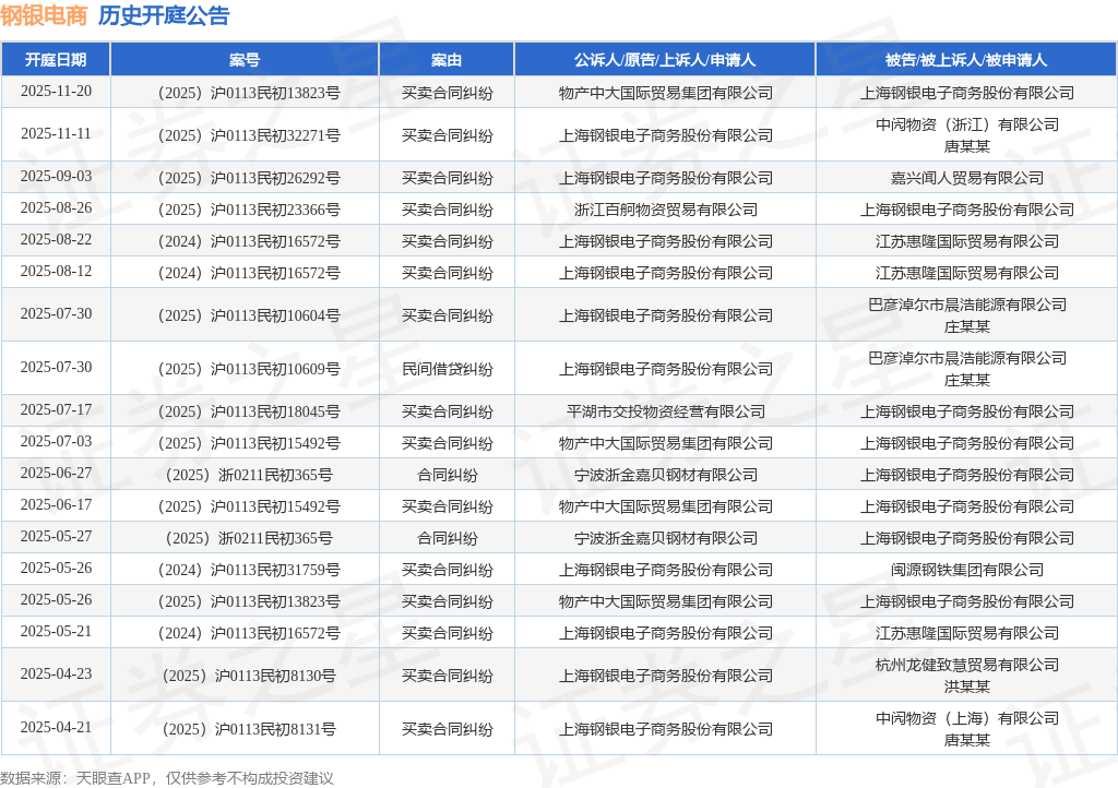 案号:(2025)沪0113民初13823号根据统计,近一年内以上海钢银电子商务股份有限公司为当事人的历史开庭公告有18则,其中案由为“买卖合同纠纷”的公告以15则居首,其次为“合同纠纷”有2则,“民间借贷纠纷”有1则。历史开庭公告如下: