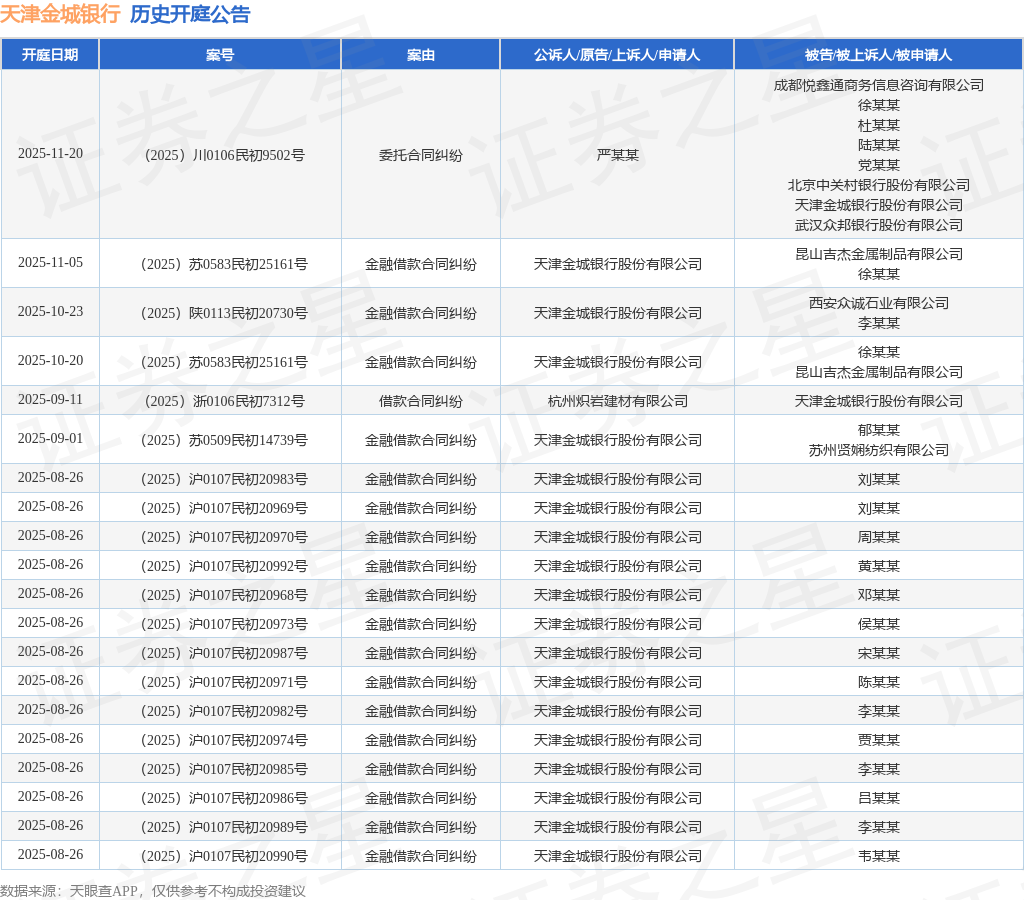 案号:(2025)川0106民初9502号根据统计,近一年内以天津金城银行股份有限公司为当事人的历史开庭公告有108则,其中案由为“金融借款合同纠纷”的公告以96则居首,其次为“借款合同纠纷”有6则,“保证合同纠纷”有2则。历史开庭公告(前20条)如下: