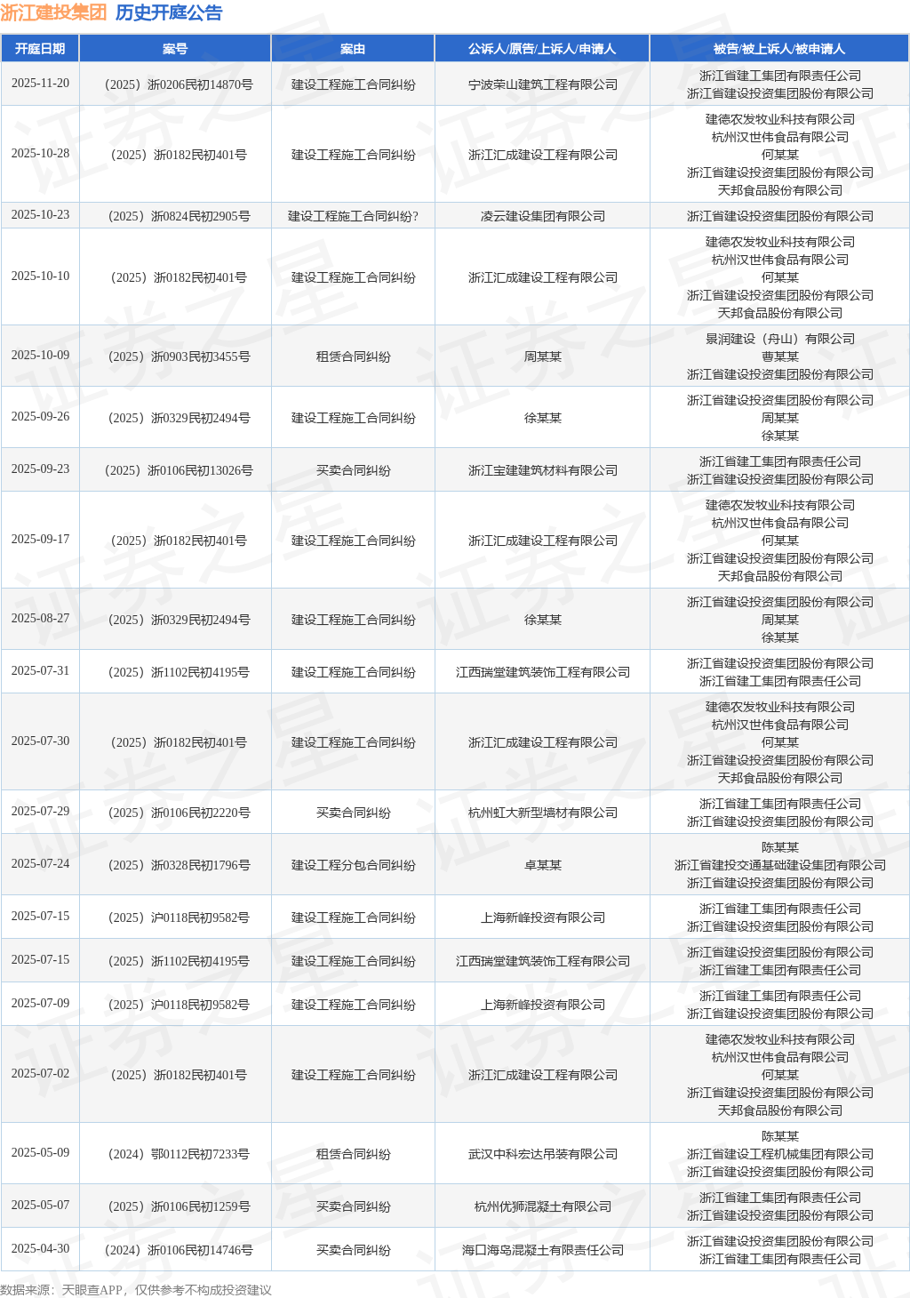 案号:(2025)浙0206民初14870号根据统计,近一年内以浙江省建设投资集团股份有限公司为当事人的历史开庭公告有41则,其中案由为“建设工程施工合同纠纷”的公告以12则居首,其次为“买卖合同纠纷”有9则,“劳务合同纠纷”有5则。历史开庭公告(前20条)如下: