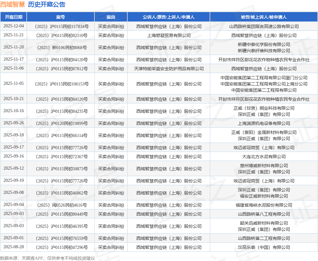 案号:(2025)新0106民初8068号根据统计,近一年内以西域智慧供应链(上海)股份公司为当事人的历史开庭公告有63则,其中案由为“买卖合同纠纷”的公告以62则居首,其次为“合同纠纷”有1则。历史开庭公告(前20条)如下: