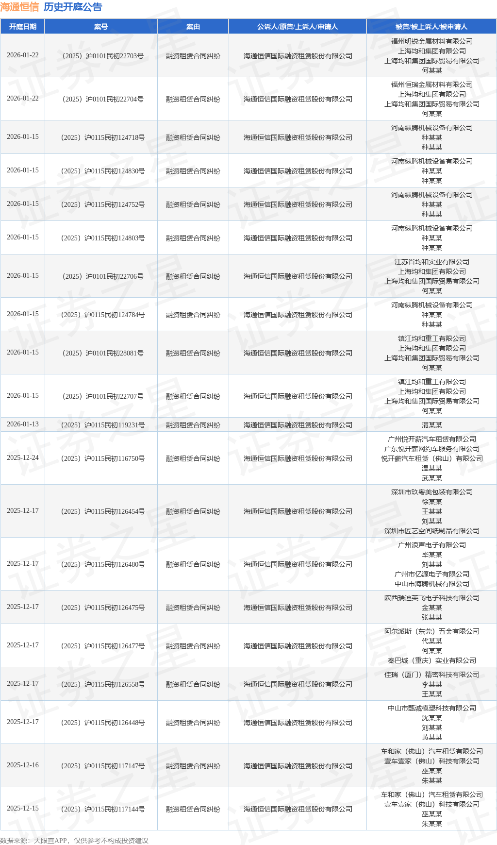 案号:(2025)沪0115民初102988号根据统计,近一年内以海通恒信国际融资租赁股份有限公司为当事人的历史开庭公告有1274则,其中案由为“融资租赁合同纠纷”的公告以1171则居首,其次为“申请实现担保物权”有28则,“合同纠纷”有18则。历史开庭公告(前20条)如下: