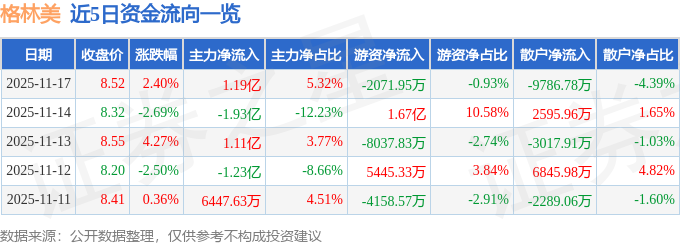 证券之星消息,截至2025年11月17日收盘,格林美(002340)报收于8.52元,上涨2.4%,换手率5.17%,成交量263.12万手,成交额22.28亿元。