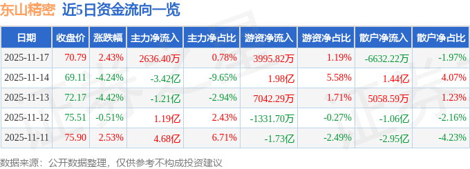 证券之星消息,截至2025年11月17日收盘,东山精密(002384)报收于70.79元,上涨2.43%,换手率3.42%,成交量47.35万手,成交额33.7亿元。