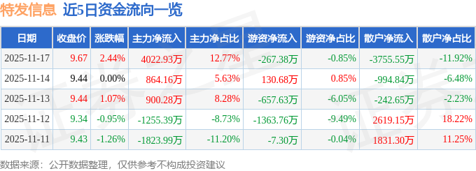 证券之星消息,截至2025年11月17日收盘,特发信息(000070)报收于9.67元,上涨2.44%,换手率3.67%,成交量32.66万手,成交额3.15亿元。