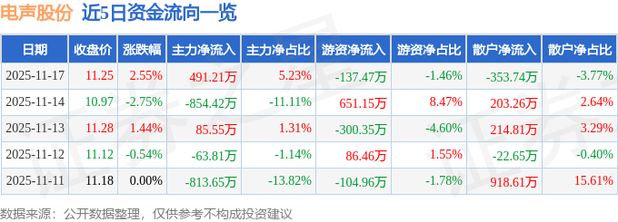 证券之星消息,截至2025年11月17日收盘,电声股份(300805)报收于11.25元,上涨2.55%,换手率2.91%,成交量8.39万手,成交额9393.62万元。