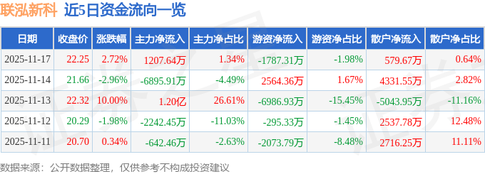 证券之星消息,截至2025年11月17日收盘,联泓新科(003022)报收于22.25元,上涨2.72%,换手率3.04%,成交量40.59万手,成交额9.04亿元。