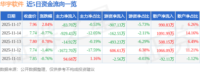 证券之星消息,截至2025年11月17日收盘,华宇软件(300271)报收于7.96元,上涨2.84%,换手率2.51%,成交量20.01万手,成交额1.58亿元。
