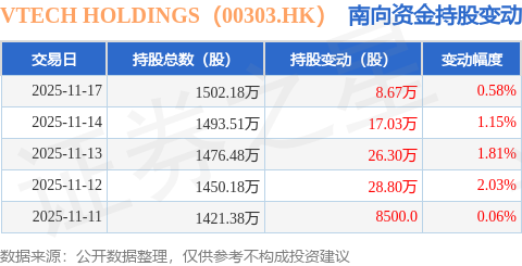 证券之星消息,11月17日南向资金增持8.67万股VTECH HOLDINGS(00303.HK)。近5个交易日中,获南向资金增持的有5天,累计净增持81.65万股。近20个交易日中,获南向资金增持的有16天,累计净增持113.56万股。截至目前,南向资金持有VTECH HOLDINGS(00303.HK)1502.18万股,占公司已发行普通股的5.93%。