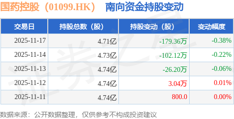 证券之星消息,11月17日南向资金减持179.36万股国药控股(01099.HK)。近5个交易日中,获南向资金减持的有3天,累计净减持304.56万股。近20个交易日中,获南向资金增持的有11天,累计净增持61.12万股。截至目前,南向资金持有国药控股(01099.HK)4.71亿股,占公司已发行普通股的35.09%。