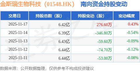 证券之星消息,11月17日南向资金增持276.6万股金斯瑞生物科技(01548.HK)。近5个交易日中,获南向资金减持的有4天,累计净减持257.5万股。近20个交易日中,获南向资金减持的有13天,累计净减持496.52万股。截至目前,南向资金持有金斯瑞生物科技(01548.HK)6.42亿股,占公司已发行普通股的29.38%。