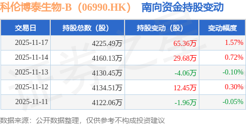 证券之星消息,11月17日南向资金增持65.36万股科伦博泰生物-B(06990.HK)。近5个交易日中,获南向资金增持的有3天,累计净增持101.47万股。近20个交易日中,获南向资金增持的有10天,累计净增持111.41万股。截至目前,南向资金持有科伦博泰生物-B(06990.HK)4225.49万股,占公司已发行普通股的25.95%。