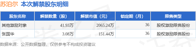 证券之星消息,根据市场公开信息整理,苏泊尔(002032)于11月18日将有45.01万股限售股份解禁,为公司股权激励限售股份,占公司总股本0.06%。(本次数据根据历史公告整理得出,实际情况以上市公司最新公告为准)最近一年内,该股累计解禁103.41万股,占总股本的0.13%。本次解禁后,公司还有50.91万股限售股份,占总股本0.06%。具体如下图所示: