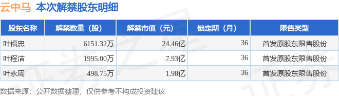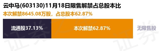 证券之星消息,根据市场公开信息整理,云中马(603130)于11月18日将有8645.08万股限售股份解禁,为公司首发原股东限售股份,占公司总股本62.87%。(本次数据根据历史公告整理得出,实际情况以上市公司最新公告为准)本次解禁后,公司已无限售股份。具体如下图所示: