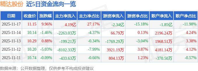 证券之星消息,截至2025年11月17日收盘,精达股份(600577)报收于11.15元,上涨9.96%,涨停,换手率6.48%,成交量139.17万手,成交额15.43亿元。