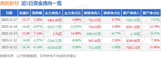 证券之星消息,截至2025年11月17日收盘,鼎胜新材(603876)报收于15.17元,上涨5.2%,换手率6.78%,成交量63.04万手,成交额9.4亿元。