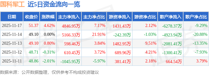 证券之星消息,截至2025年11月17日收盘,国科军工(688543)报收于51.37元,上涨4.62%,换手率11.17%,成交量12.96万手,成交额6.76亿元。