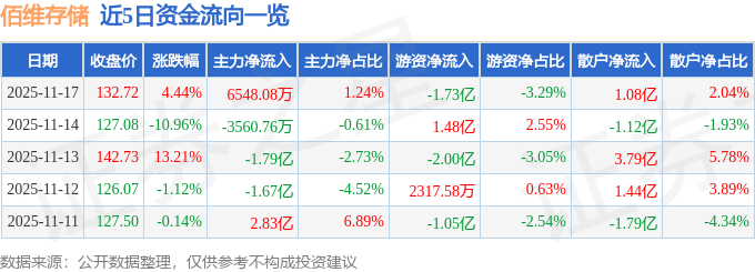 证券之星消息,截至2025年11月17日收盘,佰维存储(688525)报收于132.72元,上涨4.44%,换手率11.02%,成交量38.88万手,成交额52.69亿元。