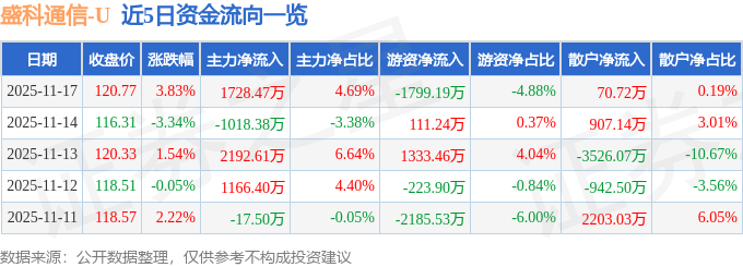 证券之星消息,截至2025年11月17日收盘,盛科通信(688702)报收于120.77元,上涨3.83%,换手率1.51%,成交量3.07万手,成交额3.69亿元。