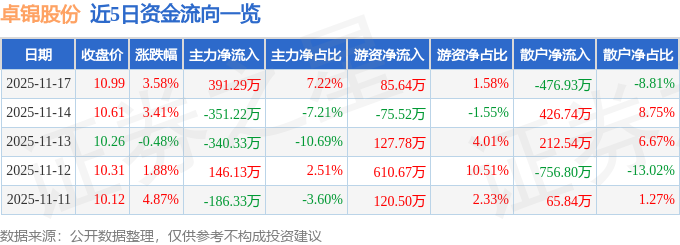 证券之星消息,截至2025年11月17日收盘,卓锦股份(688701)报收于10.99元,上涨3.58%,换手率3.72%,成交量5.0万手,成交额5416.38万元。