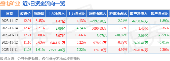 证券之星消息,截至2025年11月17日收盘,盛屯矿业(600711)报收于12.91元,上涨3.45%,换手率9.02%,成交量278.88万手,成交额35.64亿元。
