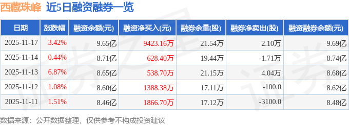 西藏珠峰融资融券信息显示,融资方面,当日融资买入2.38亿元,融资偿还1.44亿元,融资净买入9423.16万元,连续3日净买入累计1.06亿元。融券方面,融券卖出2.11万股,融券偿还100.0股,融券余量21.54万股,融券余额358.43万元。融资融券余额9.69亿元。