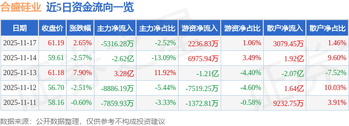 证券之星消息,截至2025年11月17日收盘,合盛硅业(603260)报收于61.19元,上涨2.65%,换手率2.96%,成交量35.02万手,成交额21.12亿元。