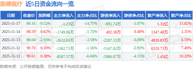 证券之星消息,截至2025年11月17日收盘,振德医疗(603301)报收于80.16元,下跌9.52%,换手率3.79%,成交量10.1万手,成交额8.33亿元。