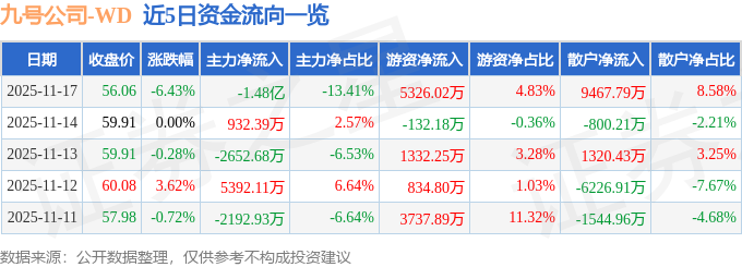 11月17日的资金流向数据方面,主力资金净流出1.48亿元,占总成交额13.41%,游资资金净流入5326.02万元,占总成交额4.83%,散户资金净流入9467.79万元,占总成交额8.58%。