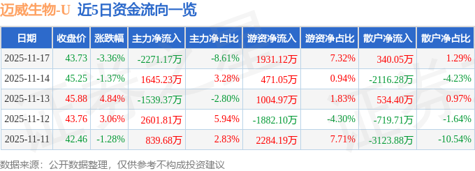 证券之星消息,截至2025年11月17日收盘,迈威生物(688062)报收于43.73元,下跌3.36%,换手率2.95%,成交量6.02万手,成交额2.64亿元。