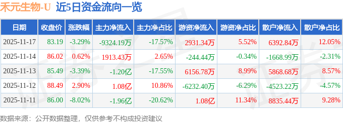 证券之星消息,截至2025年11月17日收盘,禾元生物(688765)报收于83.19元,下跌3.29%,换手率15.63%,成交量6.41万手,成交额5.31亿元。