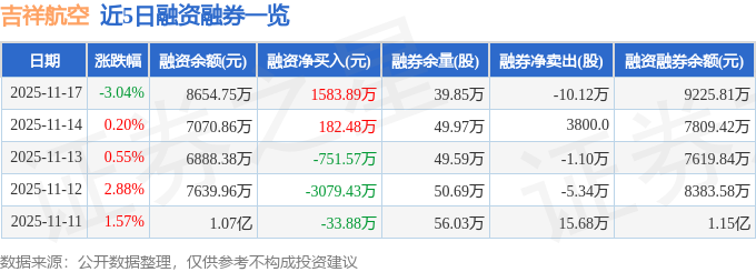 证券之星消息,截至2025年11月17日收盘,吉祥航空(603885)报收于14.33元,下跌3.04%,换手率1.35%,成交量29.44万手,成交额4.25亿元。