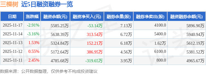 三棵树融资融券信息显示,融资方面,当日融资买入509.35万元,融资偿还562.49万元,融资净偿还53.14万元。融券方面,融券卖出6500.0股,融券偿还2400.0股,融券余量7.13万股,融券余额311.65万元。融资融券余额5896.9万元。