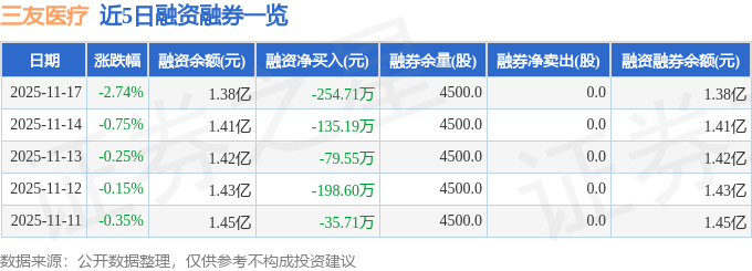 三友医疗融资融券信息显示,融资方面,当日融资买入528.89万元,融资偿还783.61万元,融资净偿还254.71万元。融券方面,融券卖出0.0股,融券偿还0.0股,融券余量4500.0股,融券余额8.64万元。融资融券余额1.38亿元。