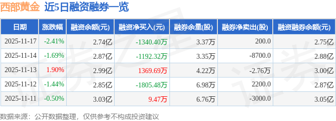 西部黄金融资融券信息显示,融资方面,当日融资买入1775.46万元,融资偿还3115.86万元,融资净偿还1340.4万元。融券方面,融券卖出1000.0股,融券偿还800.0股,融券余量3.37万股,融券余额90.11万元。融资融券余额2.75亿元。
