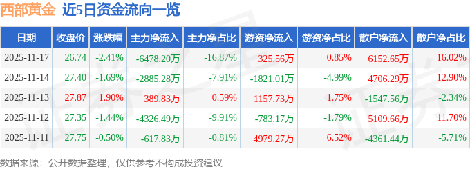 证券之星消息,截至2025年11月17日收盘,西部黄金(601069)报收于26.74元,下跌2.41%,换手率1.62%,成交量14.39万手,成交额3.84亿元。